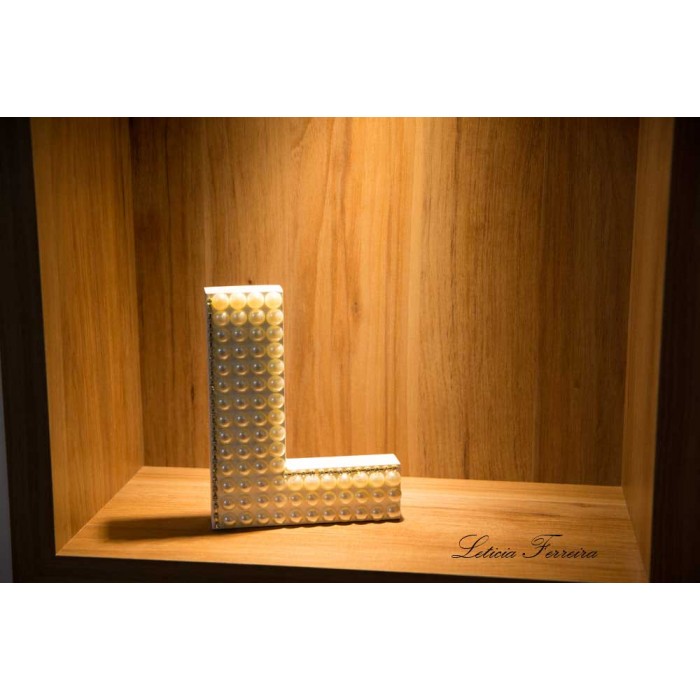 Letra em MDF com detalhe em pérolas e strass, na parte da frente.